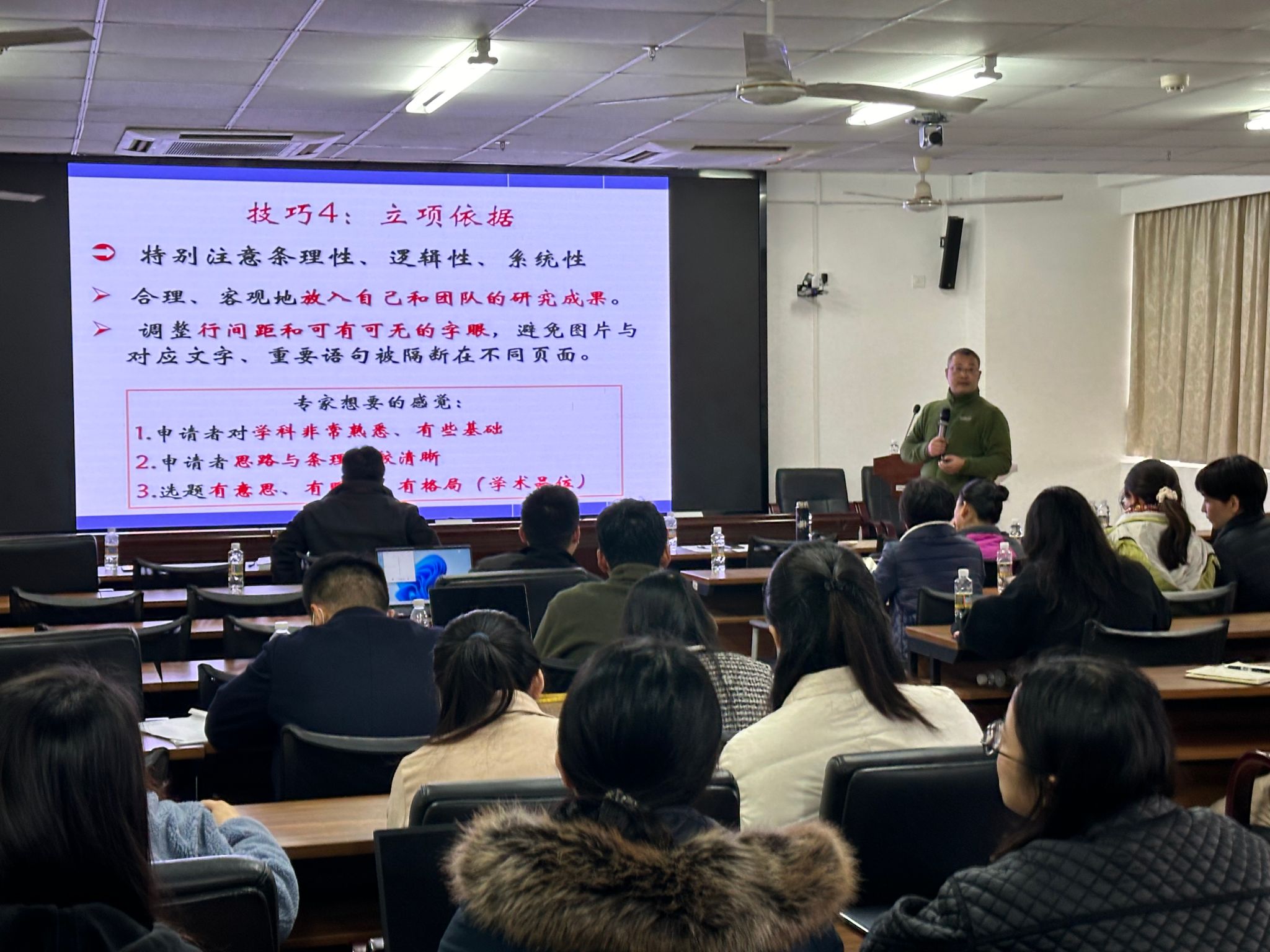 点评会针对前面的基金申请人汇报基金本子时存在的问题和意见,中间穿插请任明迅教授副经理结合他自己的申请经验和教训给大家分享《国家自然科学基金申请书撰写技巧》,通过任明迅教授的分享和各位专家的点评,后面汇报的老师比前面汇报的老师在基础研究、项目名称、立项关键、摘要等方面有了一定的改观。