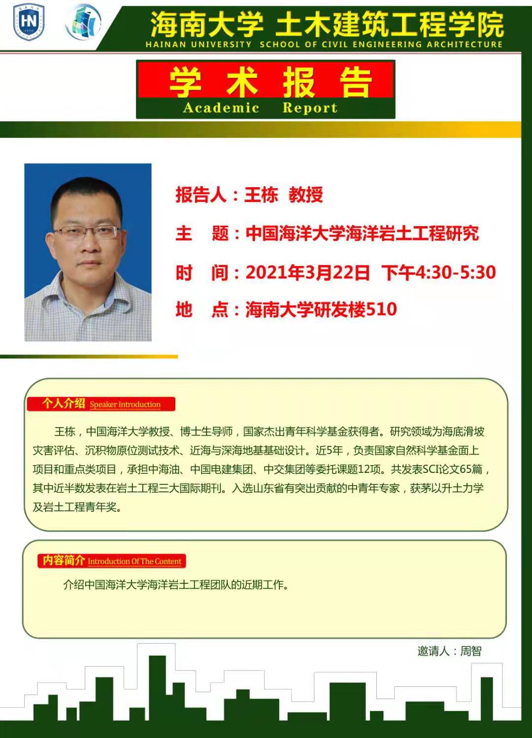 3月22日(周一)下午4:00-5:30点在威廉体育williamhill官网研发楼510,中国科学院武汉岩土力学研究所,博士生导师汪稔研究员和中国海洋大学王栋教授分别在公司做题为《岛礁建设对“一带一路”倡议的贡献》和《中国海洋大学海洋岩土工程研究》。请有兴趣的老师和没有课的研究生务必参加,到时会做参会签名,考勤记录。特此通知 学科与科研办 2021年 3月21日